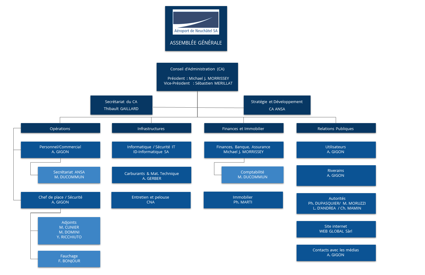 Le fonctionnement d’Aéroport de Neuchâtel SA est assuré par quelques personnes salariées à temps partiel(secrétariat), bon nombre de bénévoles (y compris le Conseil d’Administration), ainsi que par quelques entreprises mandatées.